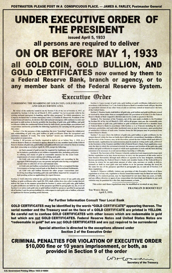 In 1933, during the depths of the Great Depression, President Franklin D. Roosevelt signed Executive Order 6102, "forbidding the hoarding of gold coin, gold bullion, and gold certificates within the continental United States."